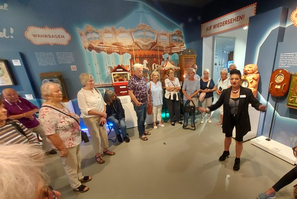 31 Heimatfreunde und –freundinnen besuchten das Deutsche Automatenmuseum auf Schloss Benkhausen. Es zeigt eine weltweit einzigartige private Kollektion von über 200 historischen Münzautomaten, gesammelt vom Unternehmer P. Gauselmann. Eine sehr kompetente und unterhaltsame Führerin präsentierte die Geschichte von Schokoladenverkäufern, Wahrsageautomaten, Einarmige Banditen, Musikboxen, Glücks- und Geldspielautomaten, Flippern, Geschicklichkeits-automaten und Pneumatische Klavieren. Erinnerungen an die eigene Vergangenheit wurden wach. Das anschließende Kaffeetrinken im Schlosscafé der „Rentei“ und der Spaziergang im Park markierten den Abschluss einer sehr gelungenen Fahrt des Heimatvereins.